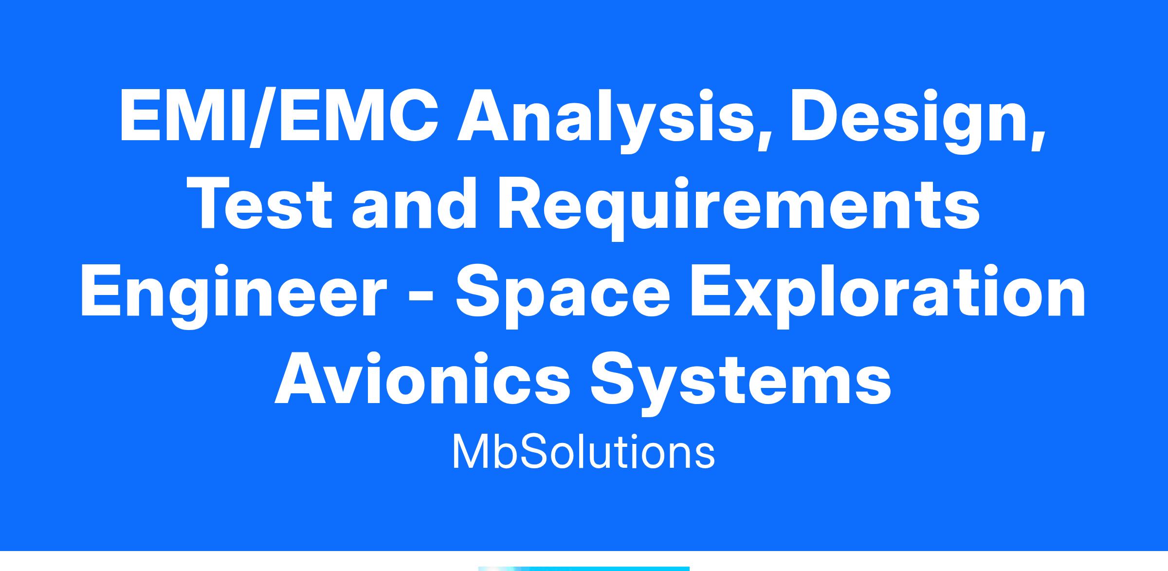 We have an exciting opportunity for a EMI/EMC Design and Test Engineer - Space Exploration Avionics Systems to join our team with Teammate company, Mb Solutions.